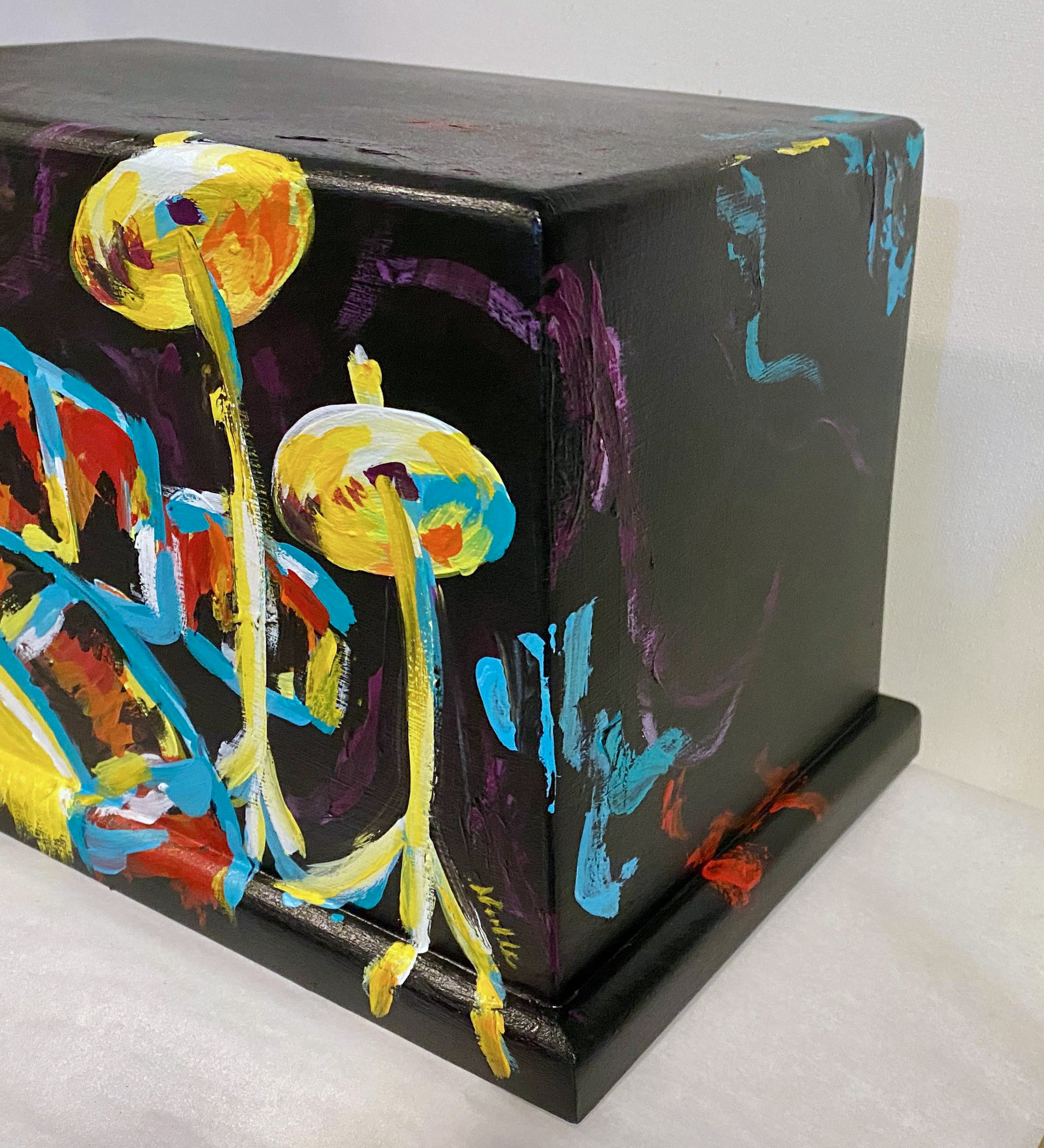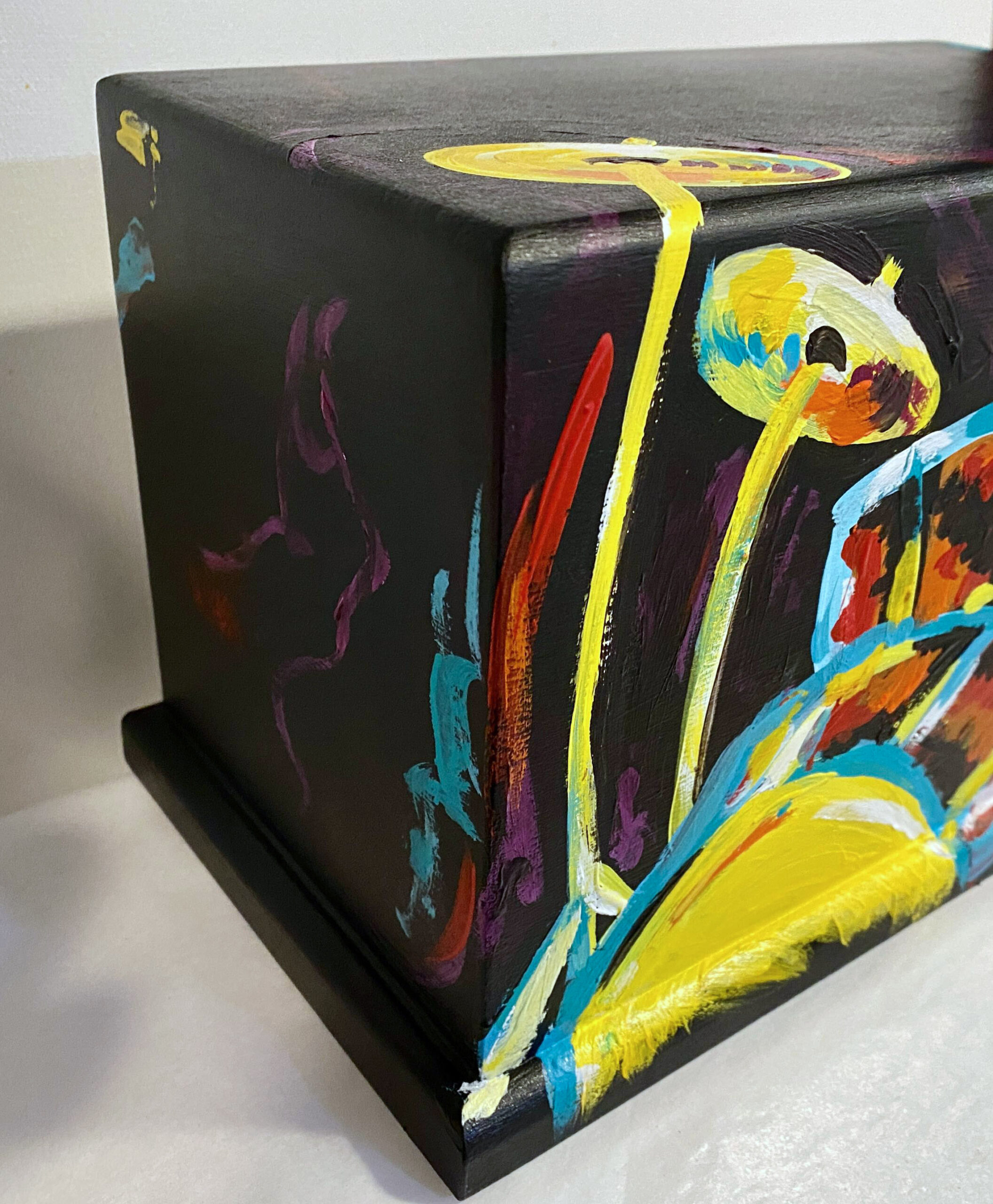 Hand painted, wood urn. A bold, vibrant, drum set covers the front of the urn. The sides are all solid black. Some of the main image extending past the front onto the sides and top. The back is ready for customization if you’d like to add a name or date or message.