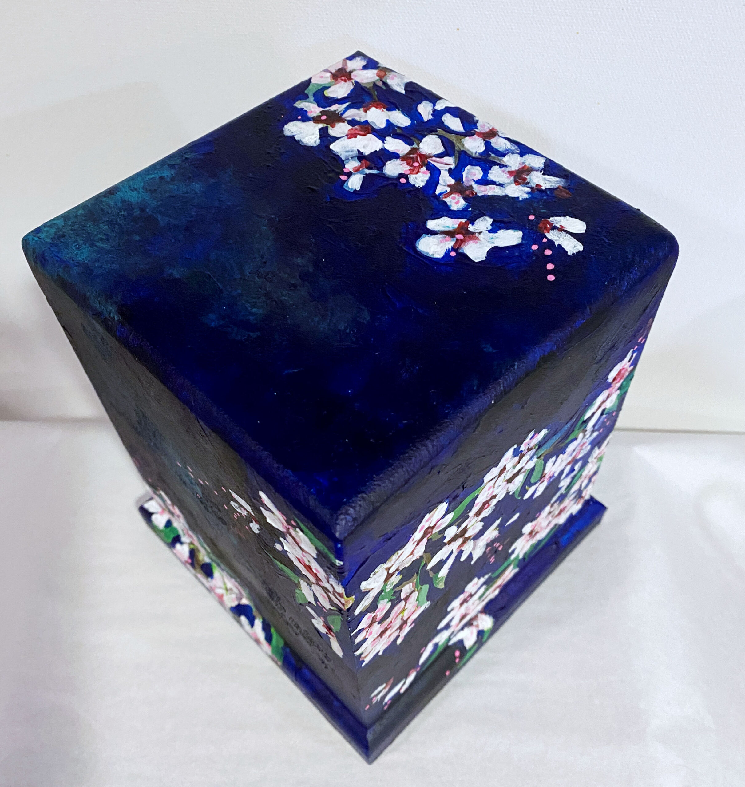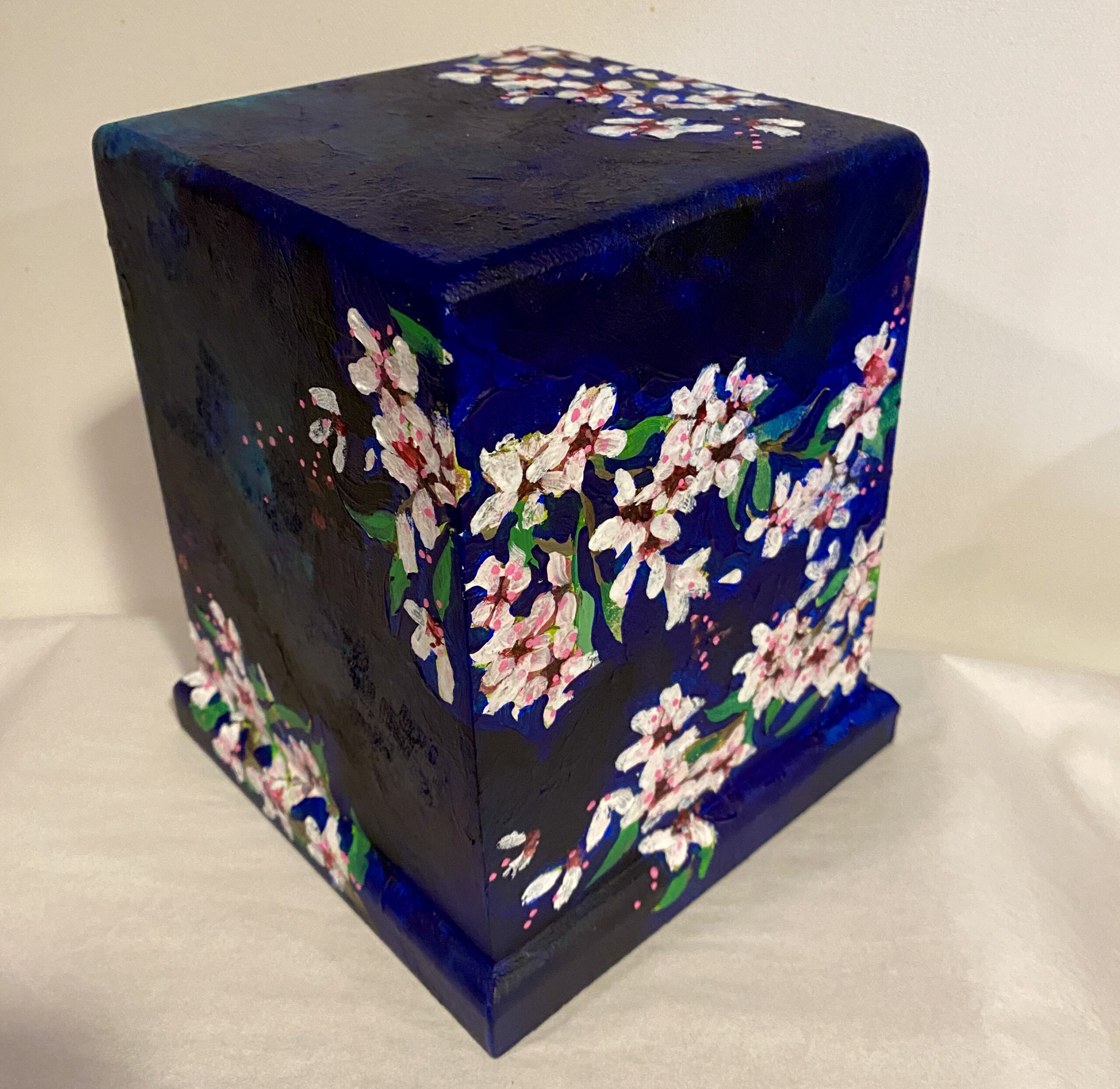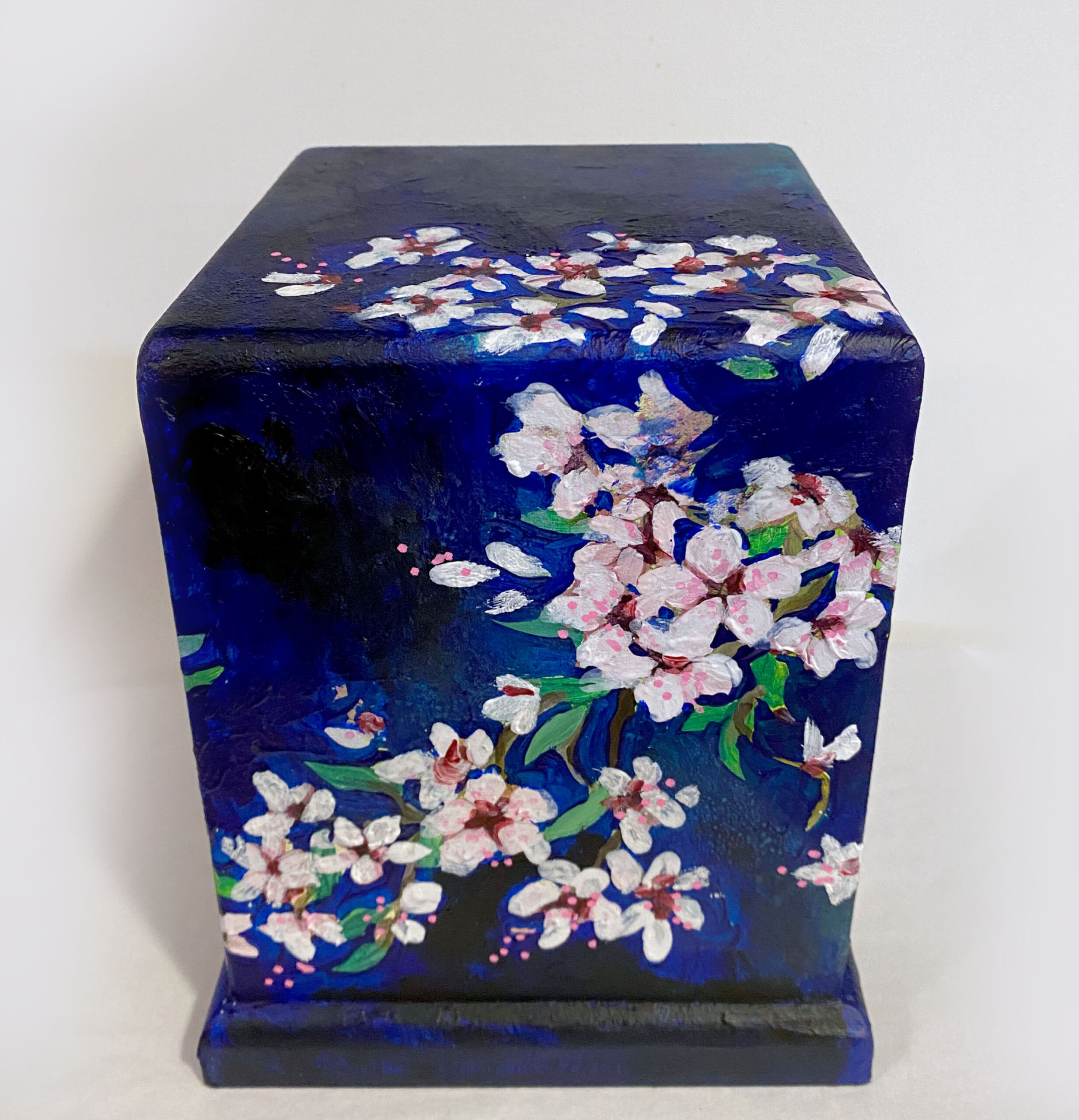 Hand painted, wood urn featuring pink cherry blossoms flowers over deep mottled layers of blues.
