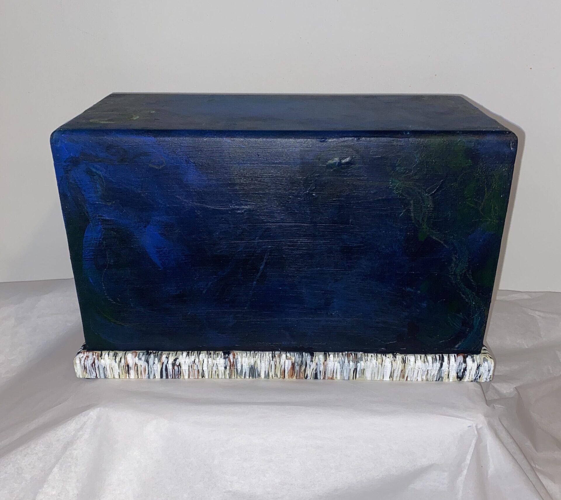 Hand drawn and painted, wood urn. This design covers all sides of the urn. A large rainbow trout fish covers the front side, accents of seaweed and plants are added around the urn. Bottom edge is painted in a birch bark design. The back has an area that can be personalized with a name, years, or message added. Made to order.