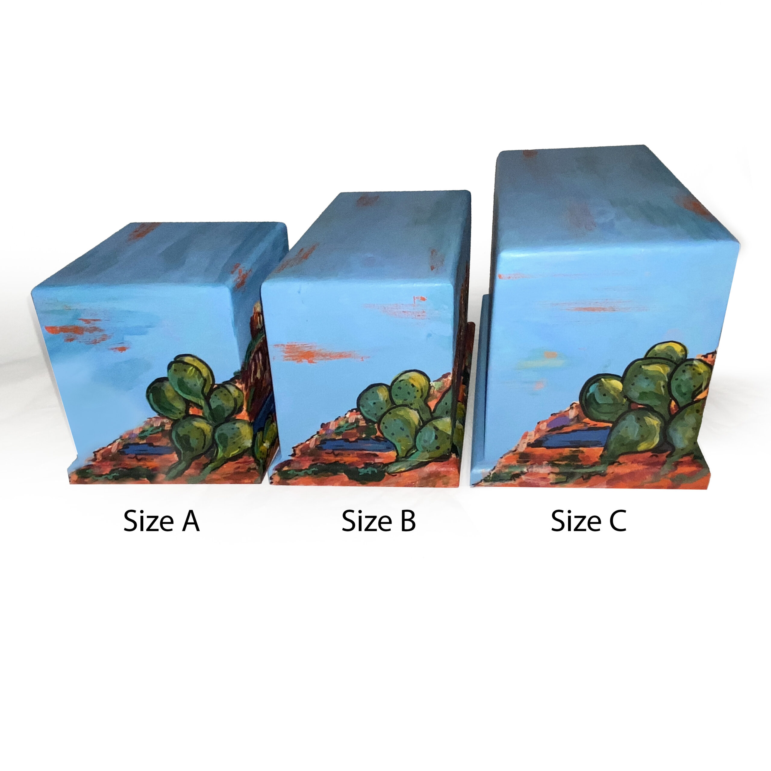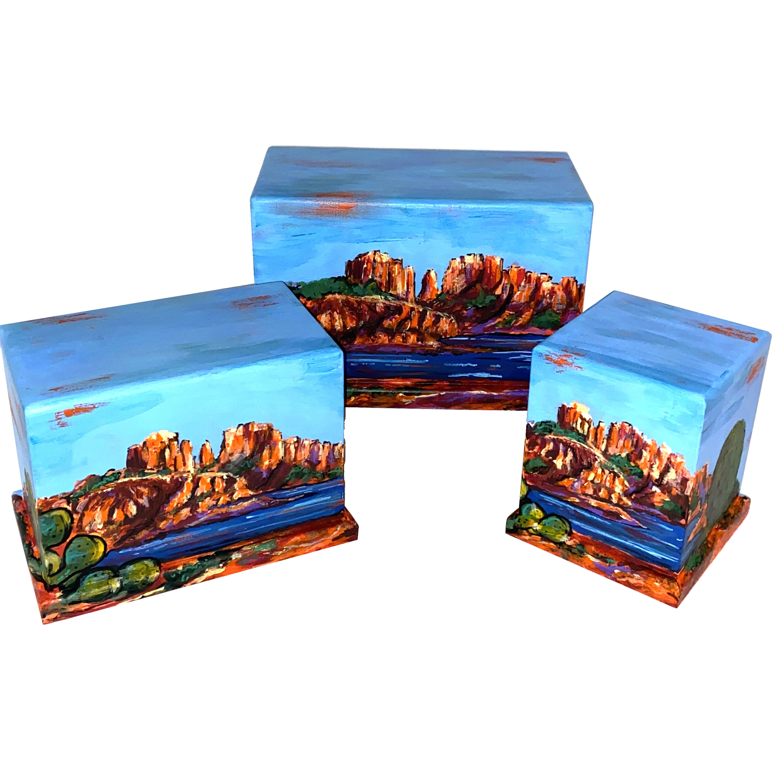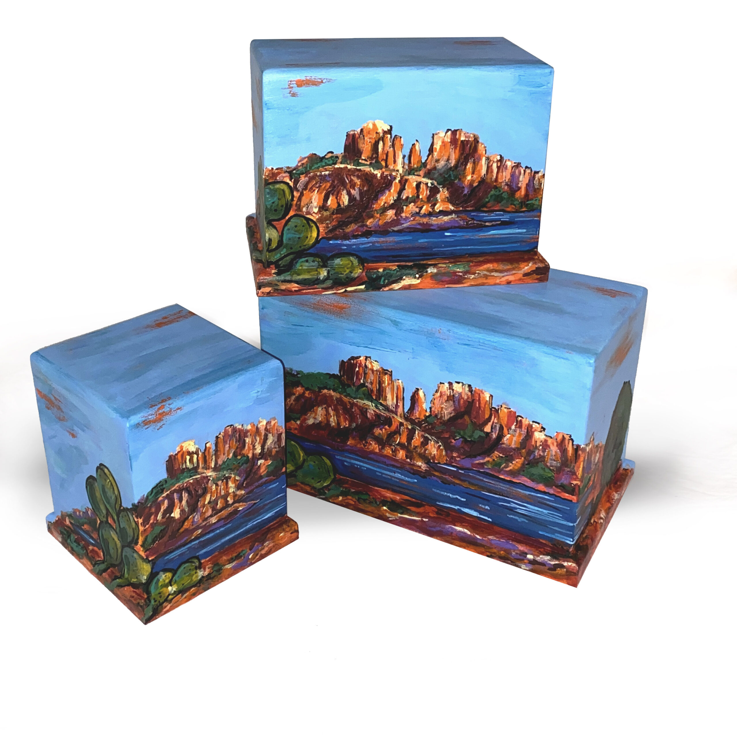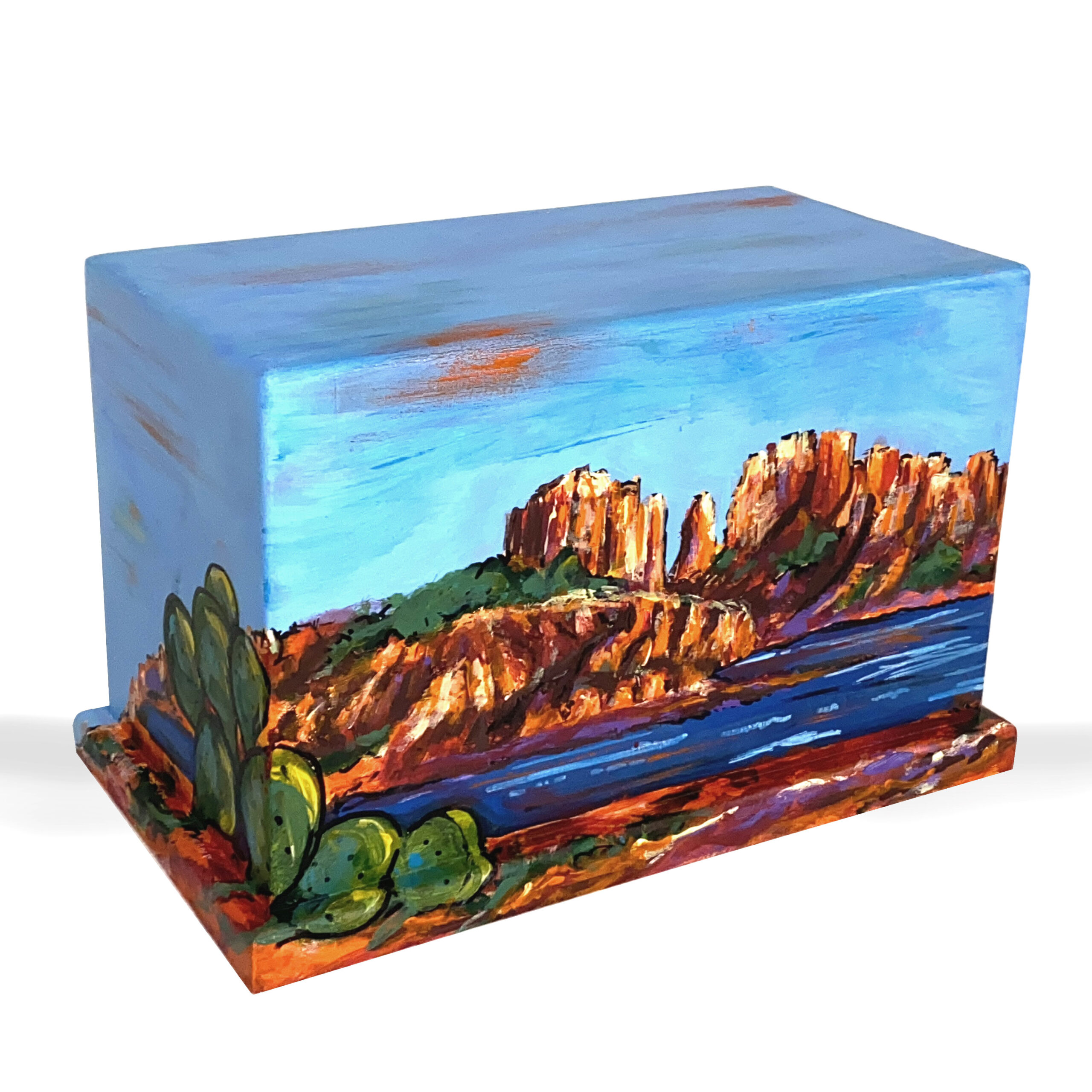 Hand crafted, wood, cremation urn featuring hand painted, Southwest Sedona Arizona with Cactus.