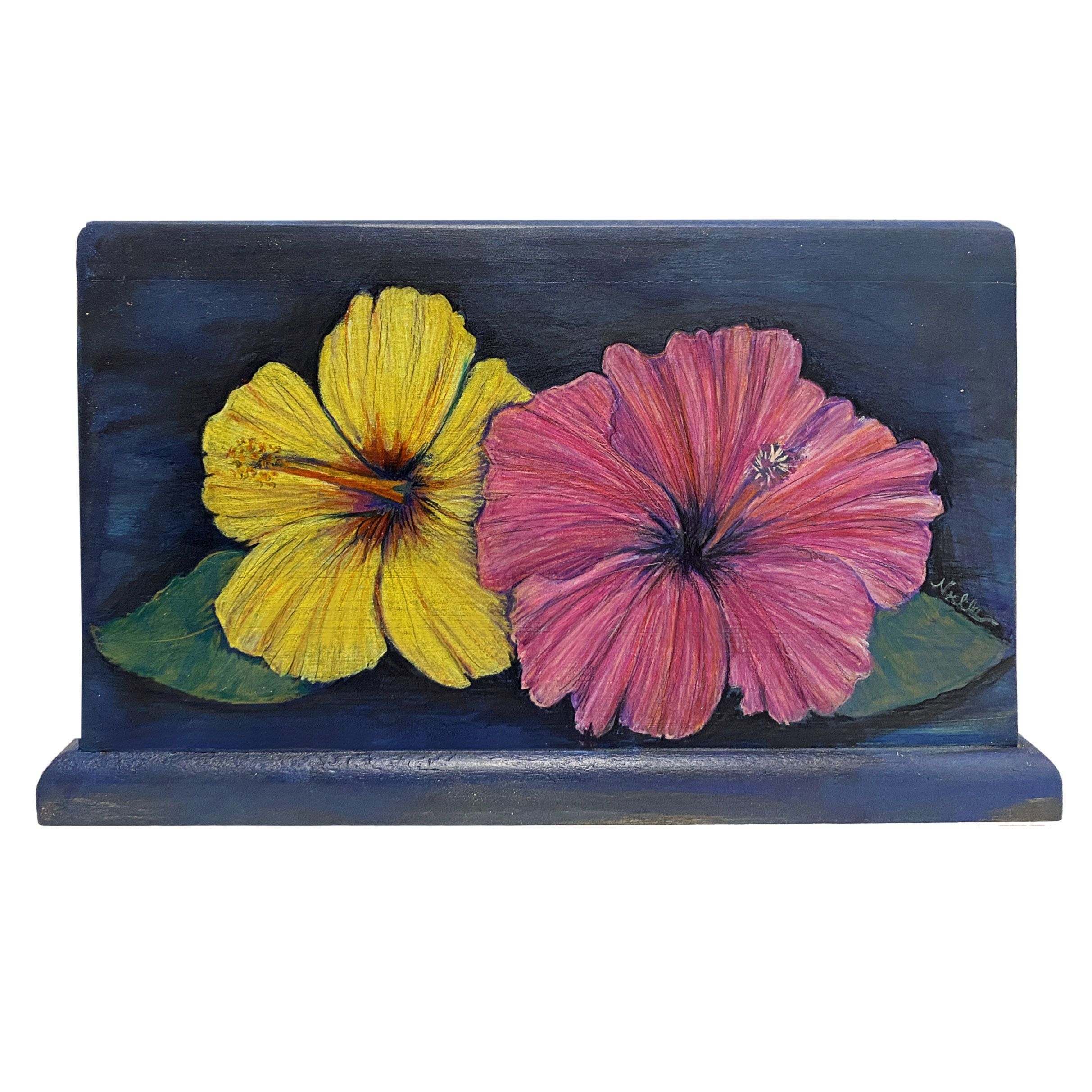 Hand painted and drawn, wood urn featuring yellow and pink hibiscus flowers over deep blue background. Subtle blue flowers along top, back right corner.