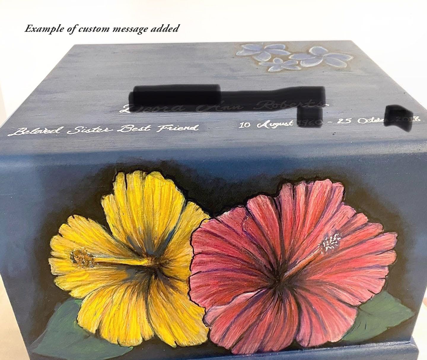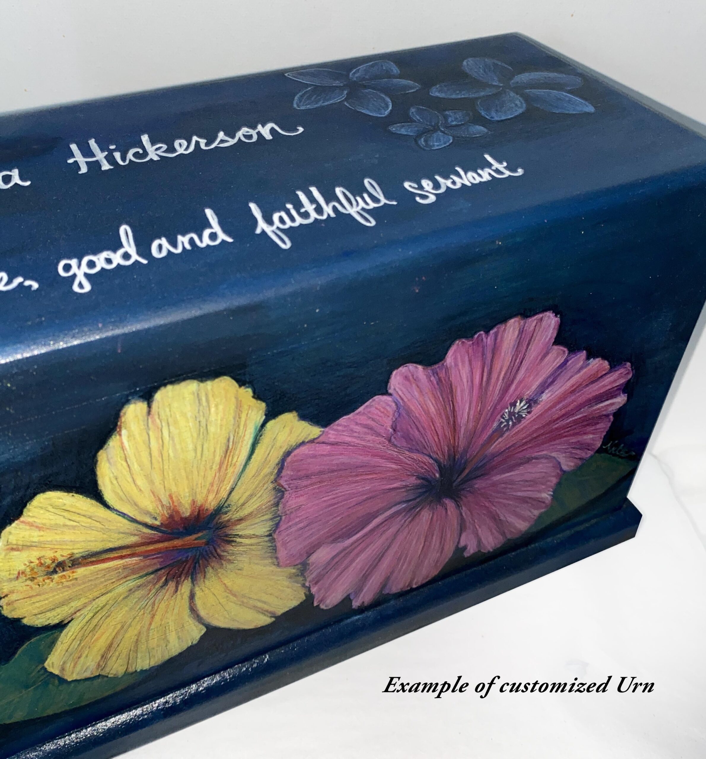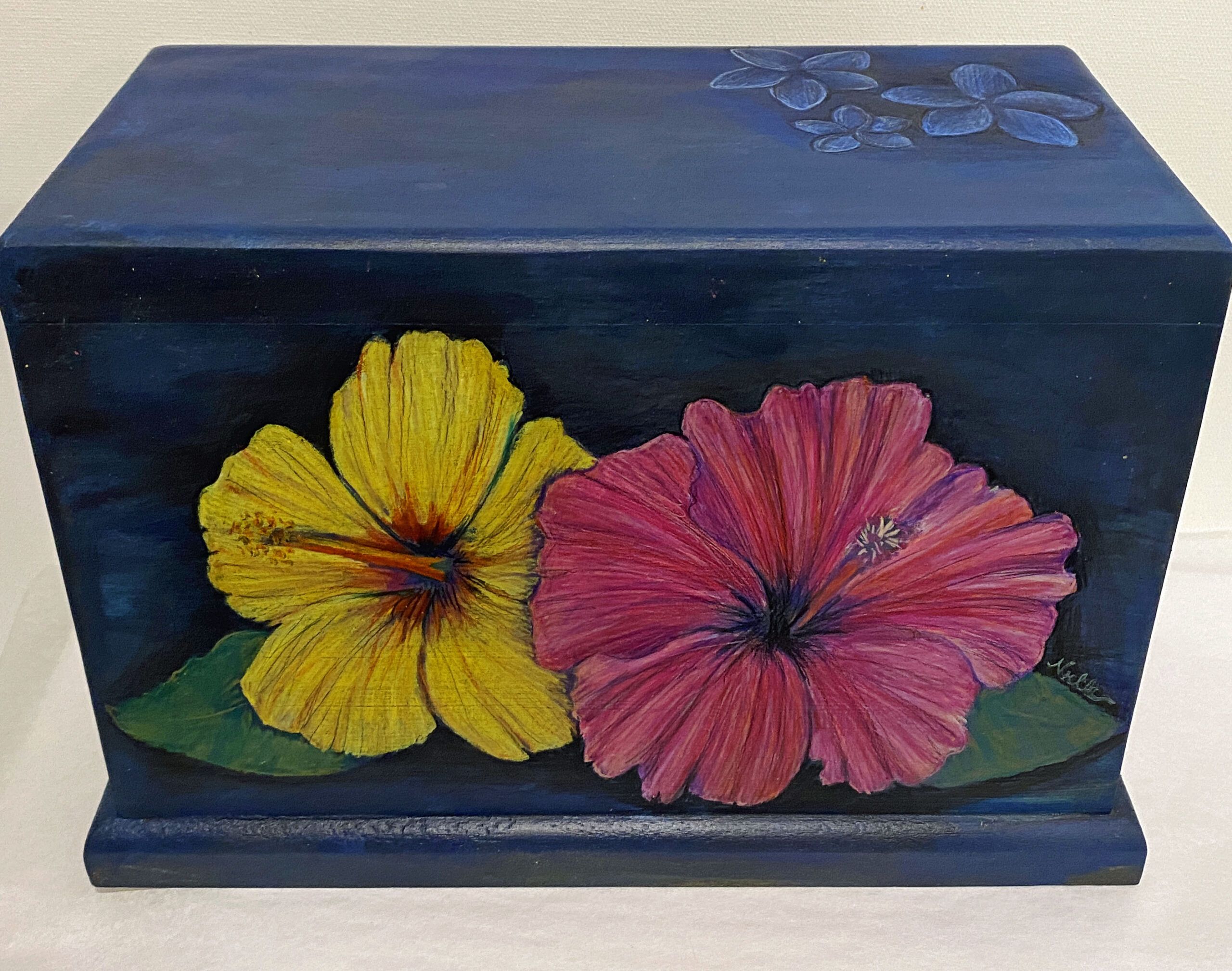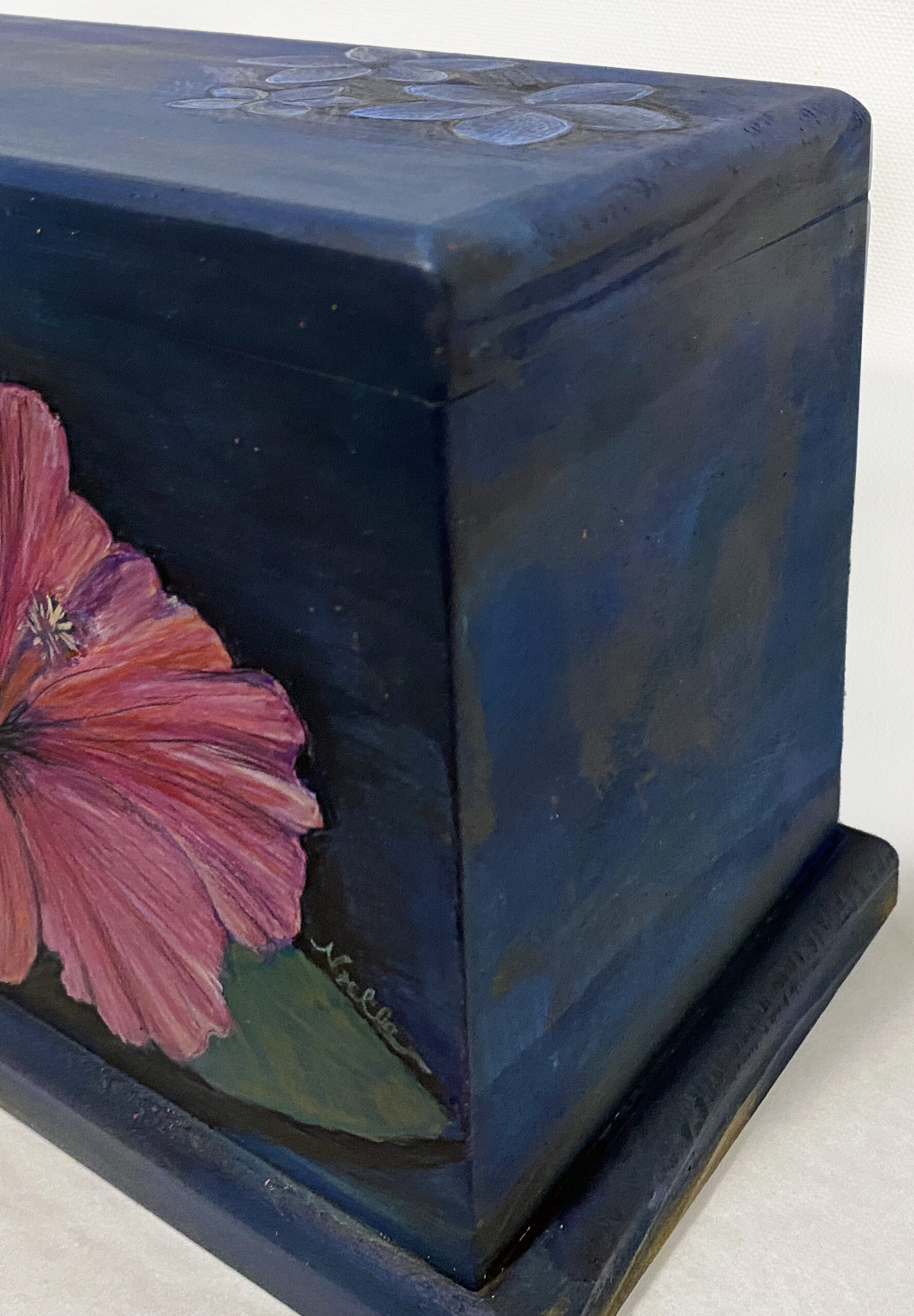 Hand crafted, wood, cremation urn featuring hand painted tropical hibiscus flowers design over a deep muted blue background.